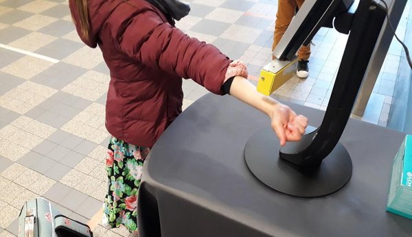 Les enfants passent d’abord devant un distributeur automatique de gel, se frottent les mains, puis se positionnent devant l’écran. Il faut que le visage humain soit « reconnu » pour que la prise de température se fasse, en passant son poignet droit sous un détecteur à infrarouge.
