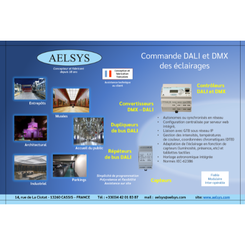 Spécialisée dans le domaine de la commande de l’éclairage, la société AELSYS conçoit et commercialise des solutions novatrices pour le contrôle d’éclairages conformes aux protocoles DALI (Digital Adressable Light Interface) et DMX512, offrant ainsi des architectures simples à mettre en œuvre, fiables et performantes pour répondre aux besoins de gestion optimisée et durable de la lumière.