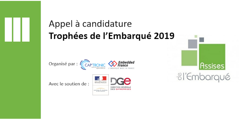 Dans le cadre des Assises de l’Embarqué organisées avec le soutien de la Direction Générale des Entreprises (DGE) du Ministère de l’Economie et des Finances, EMBEDDED FRANCE et CAP’TRONIC organisent les Trophées de l’Embarqué 2019.