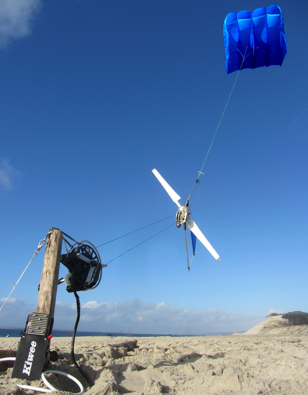 KITEWINDER a conçu et breveté un procédé de production d’électricité constitué d’une éolienne portée par une voile de cerf-volant. L’éolienne vole face au vent à une altitude stabilisée.